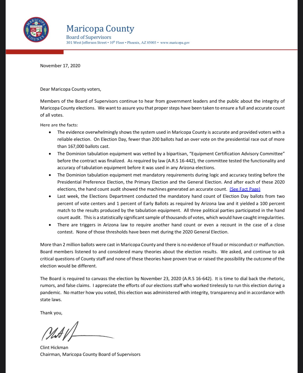 Le superviseur des elections pour le Maricopa COunty (un des county contestés par la campagne Trump), qui est un republicain, vient de publier une lettre debunkant les affirmations sur les irregularités, sur le fameux logiciel Dominion (le dada des consiprationnistes trumpistes) et sur la (non)possibilité d'un recompte des voix.